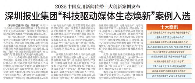 12月21日,2025中国应用新闻传播十大创新案例发布大会在成都举行,深圳报业集团“科技驱动媒体生态焕新”的实践探索成功入选。