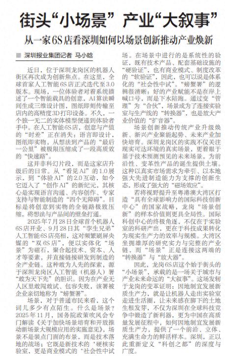 因此,龙岗6S店这个始于街头的“小场景”,承载的是一场关于城市与产业未来命运的“大叙事”。这场发轫于龙岗的变革证明:因地制宜发展新质生产力,就是让机器人走出实验室走进生活圈,让未来感在脚下的土地生根发芽,不仅为深圳在全球科技竞争中锻造了新利器,更为中国在高质量发展征程中,如何因地制宜发展新质生产力,提供了一个前沿、立体、充满生命力的鲜活样本。深圳,正以此重新定义“科创之都”的深度与广度。
